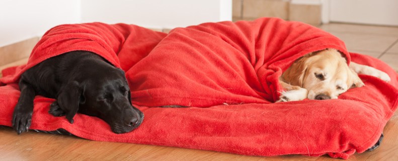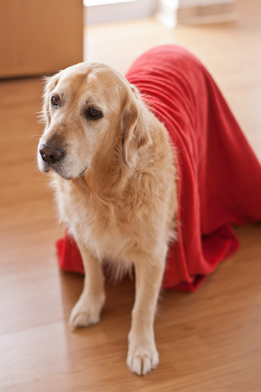 Superdog feeling better and dragging his blanket cape around