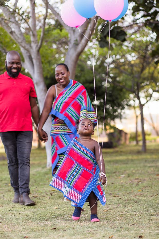The cake soon became abandoned for the helium balloons but Mom and Dad wanted to change into their traditional Venda outfits for the last part of the shoot and little Miss A was not happy.